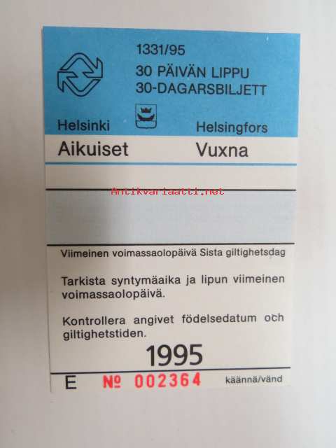 Helsinki / Liikennelaitos / HKL - HST / YTV - 1995 30 päivän lippu Aikuiset nr 002364 -matkalippu