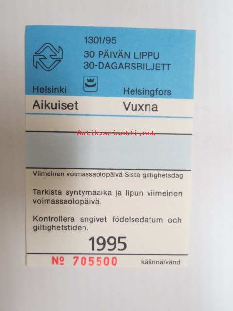 Helsinki / Liikennelaitos / HKL - HST / YTV - 1995 30 päivän lippu Aikuiset nr 705500 -matkalippu