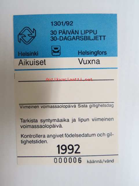Helsinki / Liikennelaitos / HKL - HST / YTV - 1992 30 päivän lippu Aikuiset nr 000006 -matkalippu