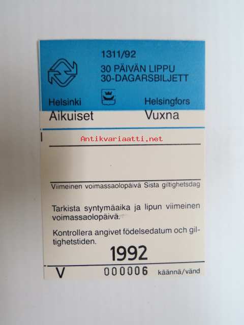 Helsinki / Liikennelaitos / HKL - HST / YTV - 1992 30 päivän lippu Aikuiset nr V 000006 -matkalippu