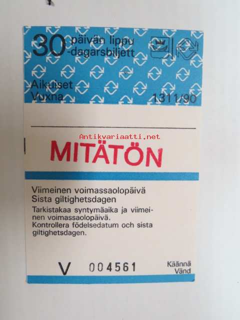 Helsinki / Liikennelaitos / HKL - HST / YTV - 1990 30 päivän lippu Aikuiset nr V 004561 MITÄTÖN -matkalippu