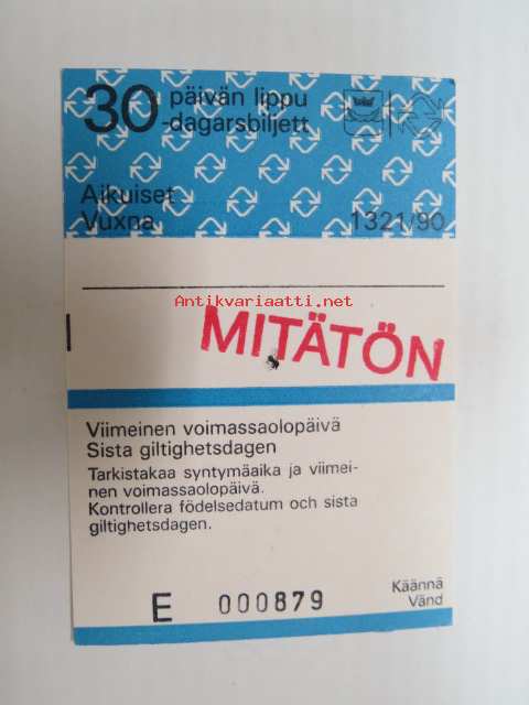 Helsinki / Liikennelaitos / HKL - HST / YTV - 1990 30 päivän lippu Aikuiset nr E 000879 MITÄTÖN -matkalippu