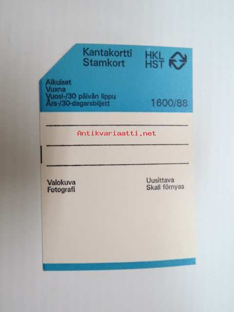 Helsinki / Liikennelaitos / HKL - HST / YTV - 1988 Kantakortti Aikuiset Vuosi / 30 päivän lippu -matkalippu