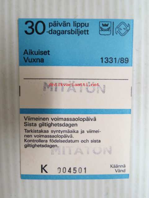 Helsinki / Liikennelaitos / HKL - HST / YTV - 1989 30 päivän lippu Aikuiset Mitätön nr K 004501 -matkalippu