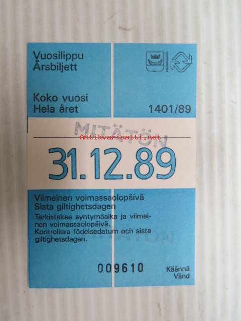 Helsinki / Liikennelaitos / HKL - HST / YTV - 1989 Vuosilippu Koko vuosi nr 009610 -matkalippu