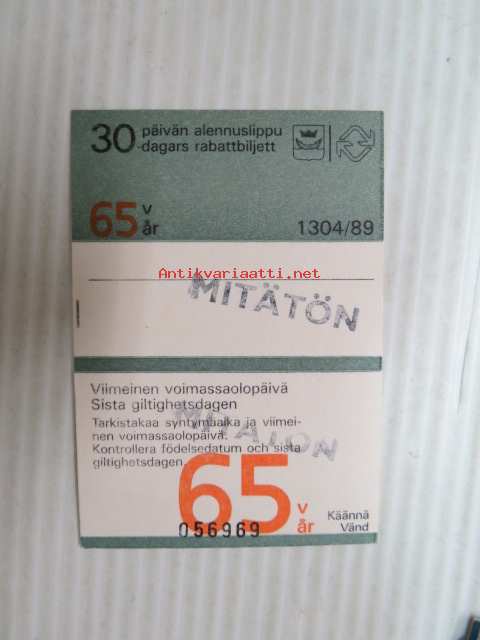 Helsinki / Liikennelaitos / HKL - HST / YTV - 1989 30 päivän alennuslippu 65 v nr 056969 -matkalippu