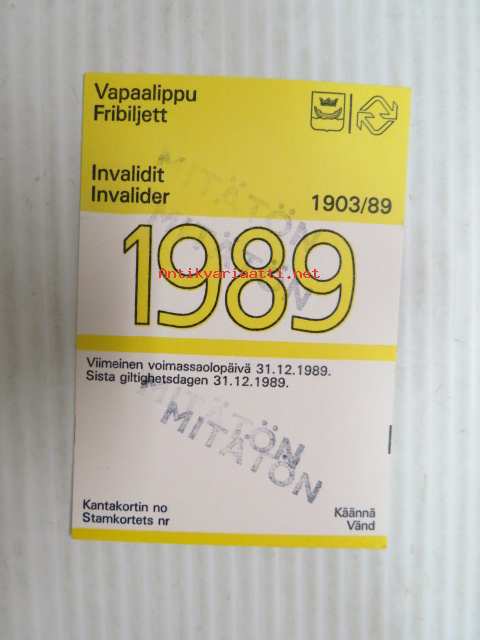 Helsinki / Liikennelaitos / HKL - HST / YTV - 1989 Vapaalippu Invalidit Mitätön -matkalippu