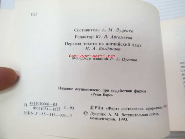 | Saatavilla | 1 kpl | | Julkaisuvuosi | 1993 | | Painos | 1. | | Kunto | K3 | | Sidonta/painoasu | Sidottu (kansipaperit) | | ISBN | 5-85-116-004-7 | | Kielet | Englanti, Venäjä |
