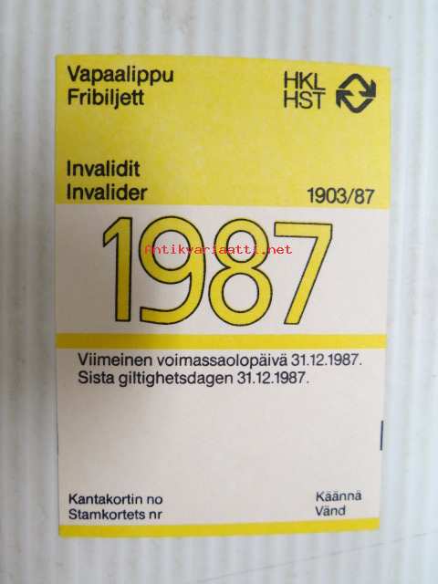 Helsinki / Liikennelaitos / HKL - HST / YTV - 1987 Vapaalippu Invalidit -matkalippu