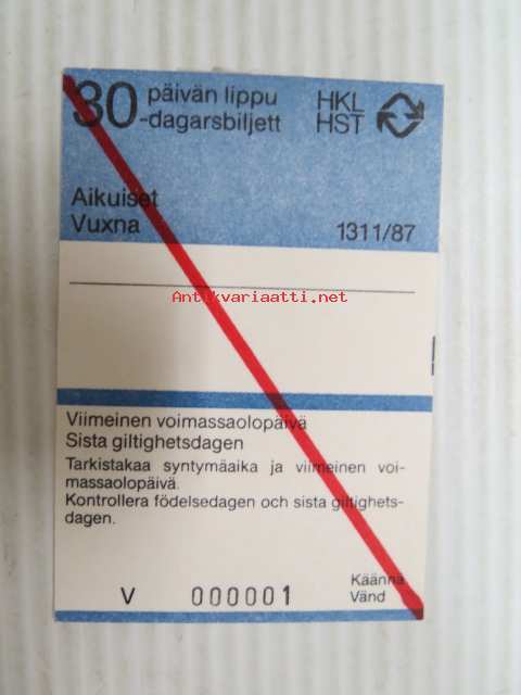 Helsinki / Liikennelaitos / HKL - HST / YTV - 1987 30 päivän lippu Aikuiset Punaraita nr V 000001 -matkalippu
