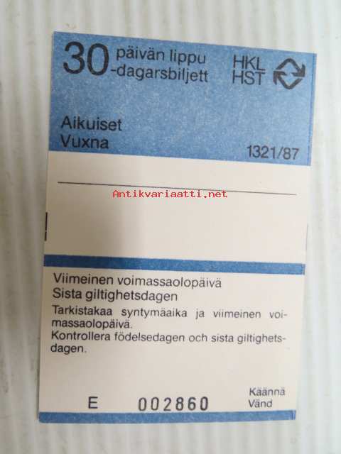 Helsinki / Liikennelaitos / HKL - HST / YTV - 1987 30 päivän lippu Aikuiset nr E 002860 -matkalippu