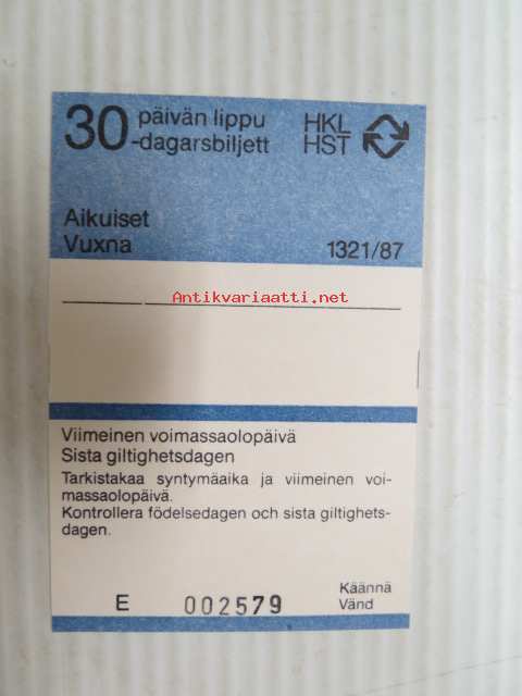 Helsinki / Liikennelaitos / HKL - HST / YTV - 1987 30 päivän lippu Aikuiset nr E 002579 -matkalippu