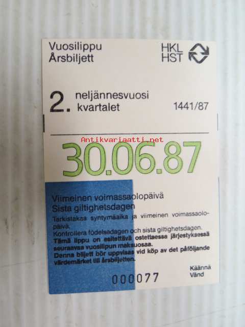 Helsinki / Liikennelaitos / HKL - HST / YTV - 1987 Vuosilippu 2. neljännesvuosi nr 000077 -matkalippu