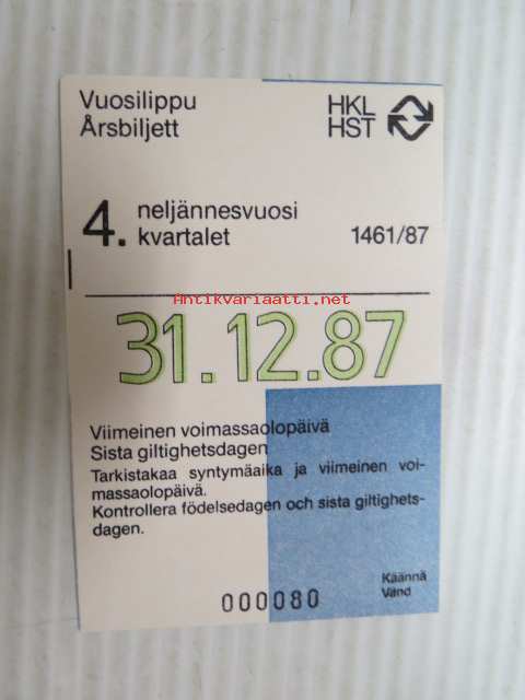 Helsinki / Liikennelaitos / HKL - HST / YTV - 1987 Vuosilippu 4. neljännesvuosi nr 000080 -matkalippu