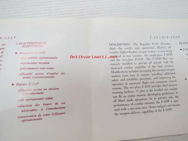 F-105D / F-105F Thunderchief hävittäjälentokone -ranskan- ja englanninkielinen esite