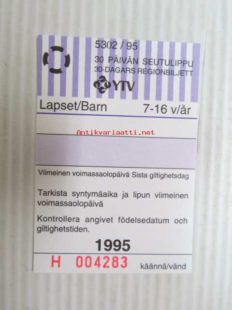 Helsinki / Liikennelaitos / HKL - HST / YTV - 1995 30 päivän seutulippu Lapset nr 004283 -matkalippu