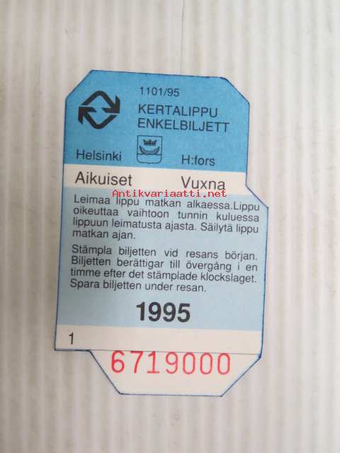 Helsinki / Liikennelaitos / HKL - HST / YTV - 1995 Kertalippu Aikuiset nr 6719000 -matkalippu