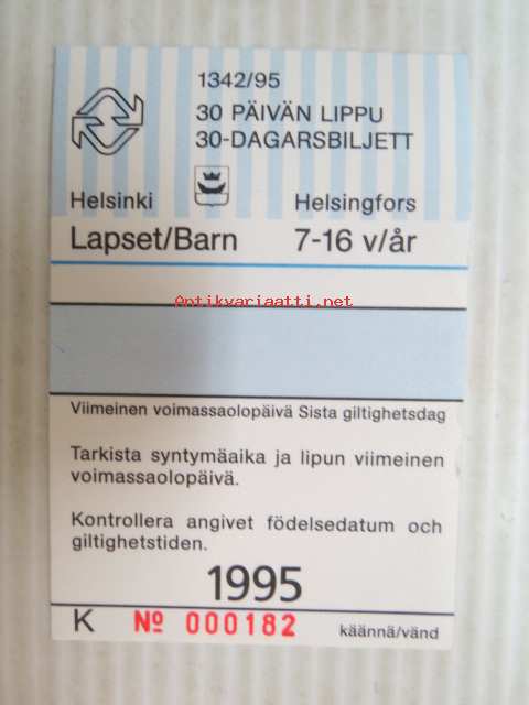 Helsinki / Liikennelaitos / HKL - HST / YTV - 1995 30 päivän lippu Lapset nr K 000182