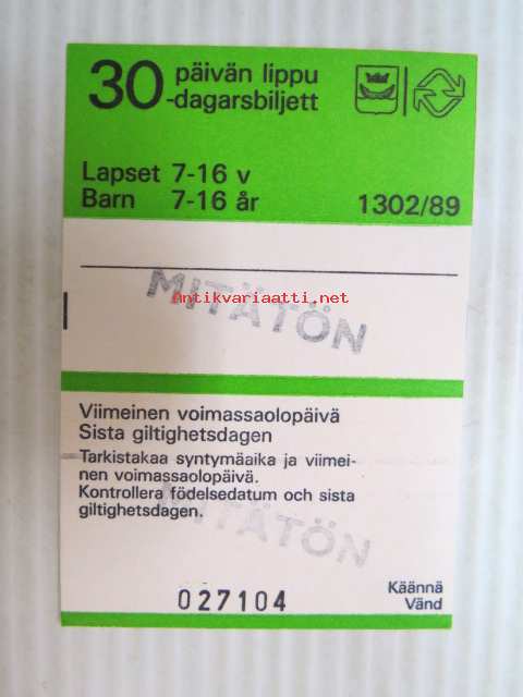 Helsinki / Liikennelaitos / HKL - HST / YTV - 1987 30 päivän lippu Lapset Mitätön nr 027104 -matkalippu
