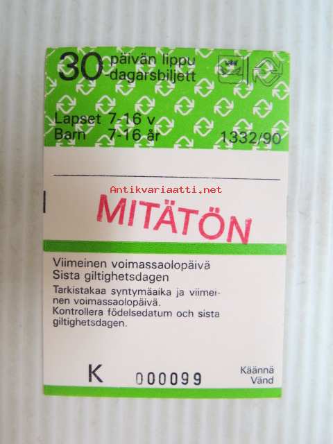 Helsinki / Liikennelaitos / HKL - HST / YTV - 1990 30 päivän lippu Lapset Mitätön nr K 000099 -matkalippu