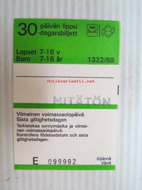 Helsinki / Liikennelaitos / HKL - HST / YTV - 1989 30 päivän lippu Lapset Mitätön nr E 099992 -matkalippu
