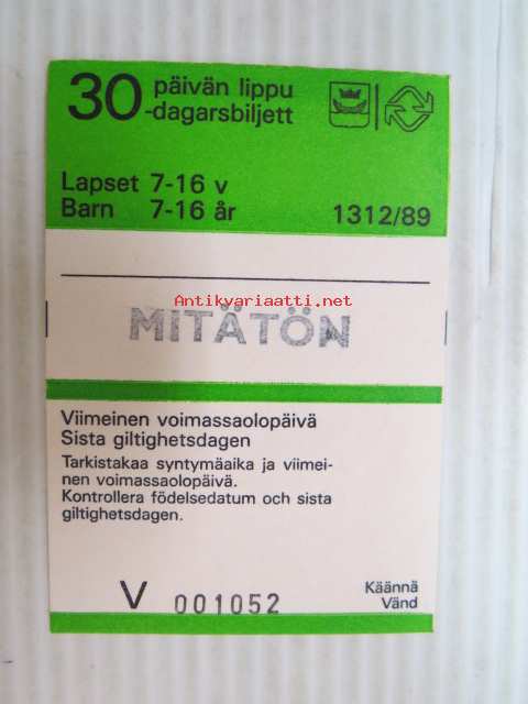 Helsinki / Liikennelaitos / HKL - HST / YTV - 1989 30 päivän lippu Lapset Mitätön nr V 001052 -matkalippu