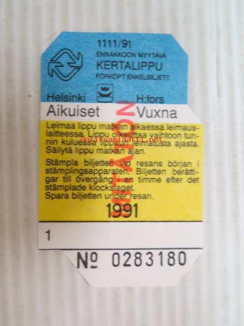 Helsinki / Liikennelaitos / HKL - HST / YTV - 1991 Ennakkoon myytävä kertalippu Aikuiset Mitätön nr 0283180 -matkalippu