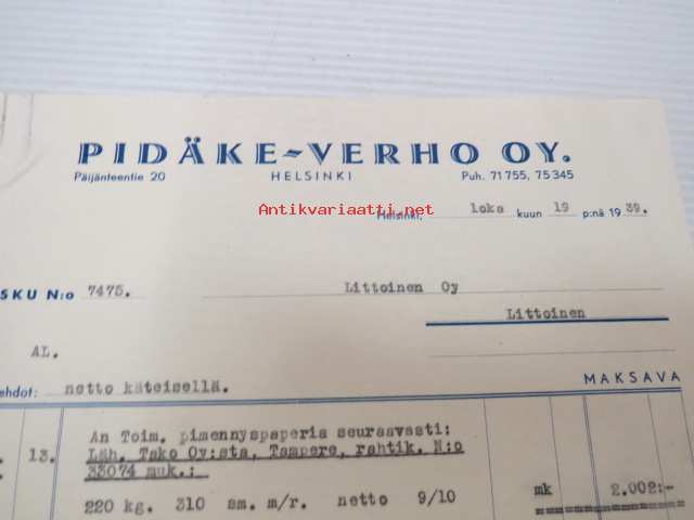 Pidäke-Verho Oy, Helsinki 19.10.1939 -asiakirja