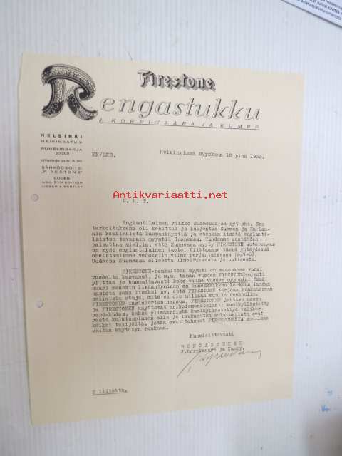 Firestone Rengastukku J. Korpivaara ja kumpp., Helsinki 12.9.1933 -asiakirja
