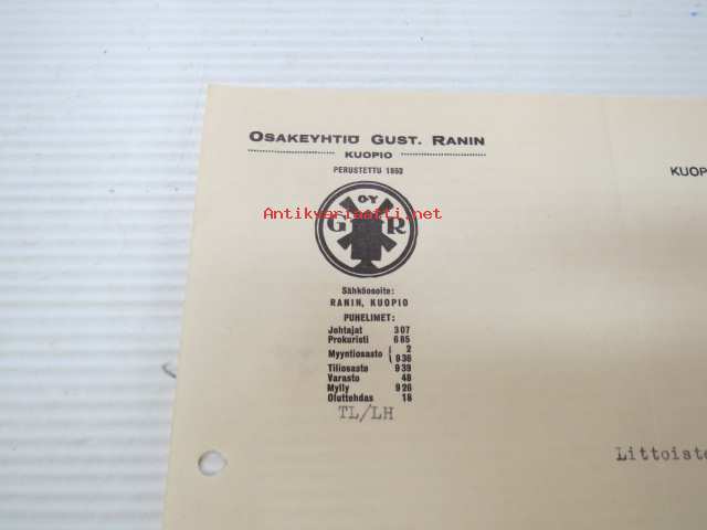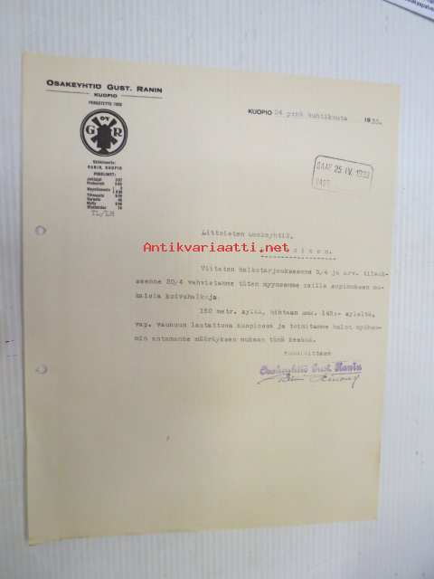 Osakeyhtiö Gust. Ranin, Kuopio 24.4.1933 -asiakirja