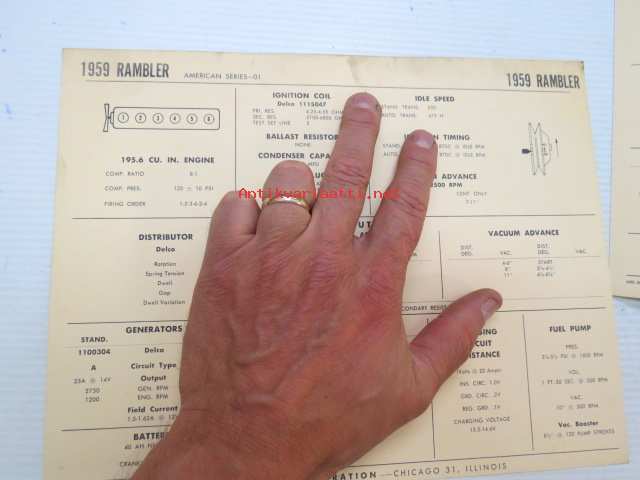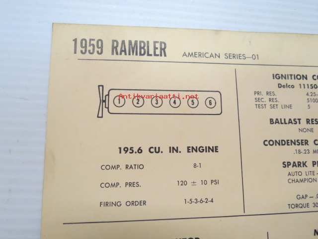 Rambler American Series-01 1959 Data sheet / Sun Electric Corporation -säätöarvot taulukko