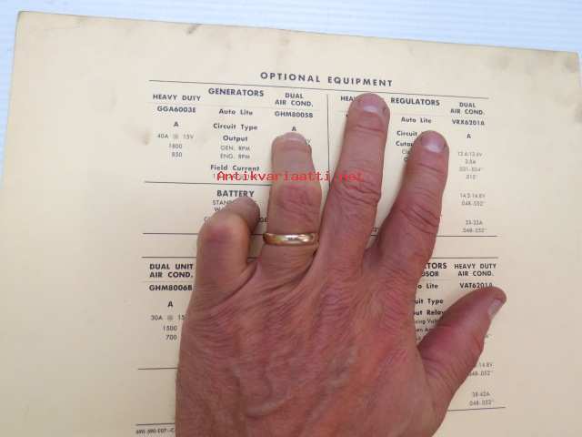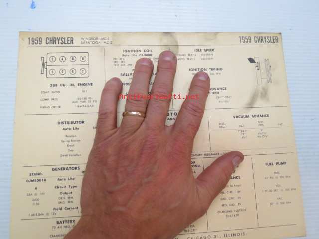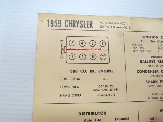 Chrysler Windsor - MC-1, Saratoga - MC-2 1959 Data sheet / Sun Electric Corporation -säätöarvot taulukko