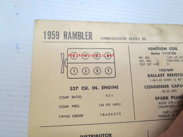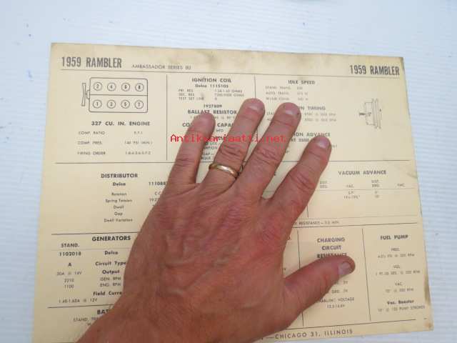 Rambler Ambassador Series 80 1959 Data sheet / Sun Electric Corporation -säätöarvot taulukko