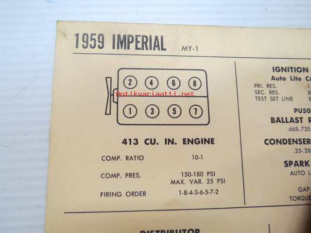 Imperial MY-1 1959 Data sheet / Sun Electric Corporation -säätöarvot taulukko