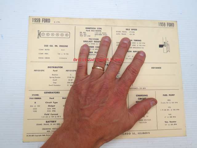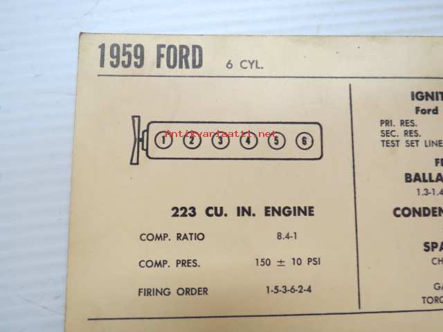 Ford 6-cyl. 1959 Data sheet / Sun Electric Corporation -säätöarvot taulukko