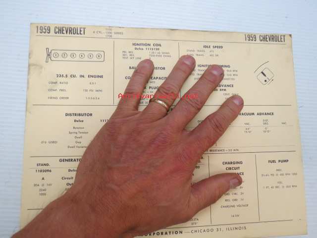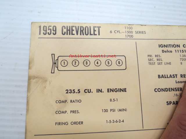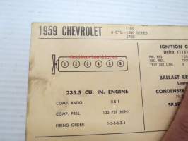 Chevrolet 6-cyl. 1100, 1500, 1700 Series 1959 Data sheet / Sun Electric Corporation -säätöarvot taulukko