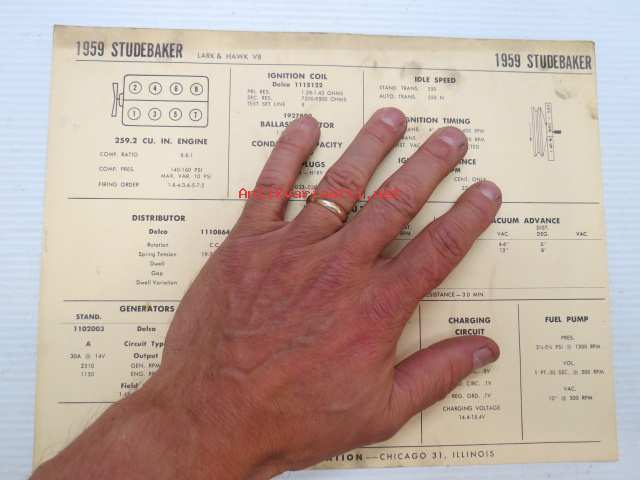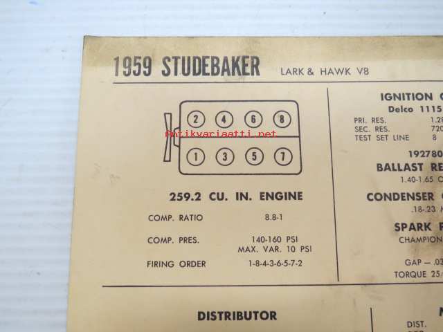 Studebaker Lark & Hawk V-8 1959 Data sheet / Sun Electric Corporation -säätöarvot taulukko