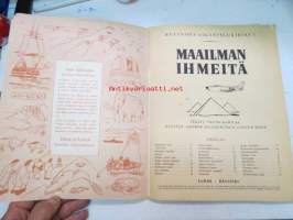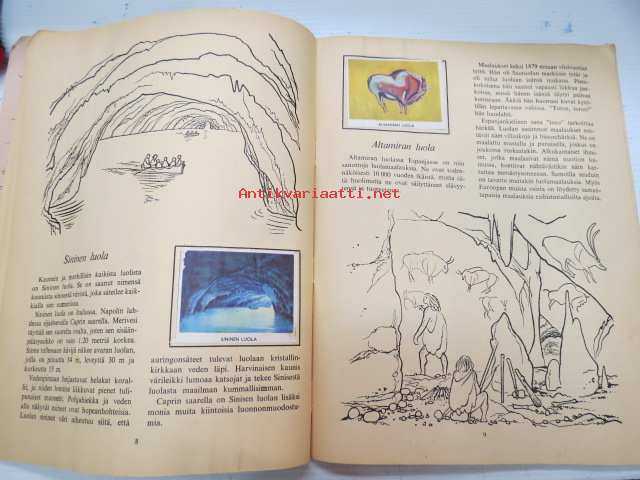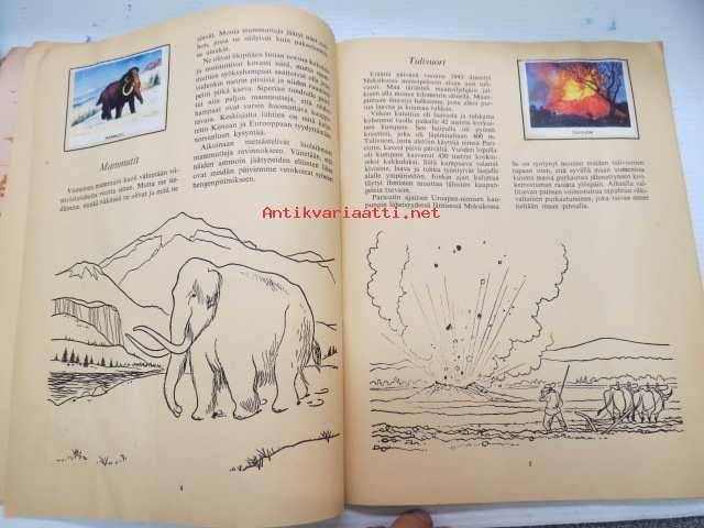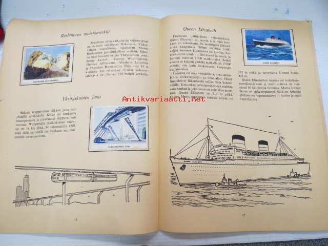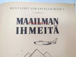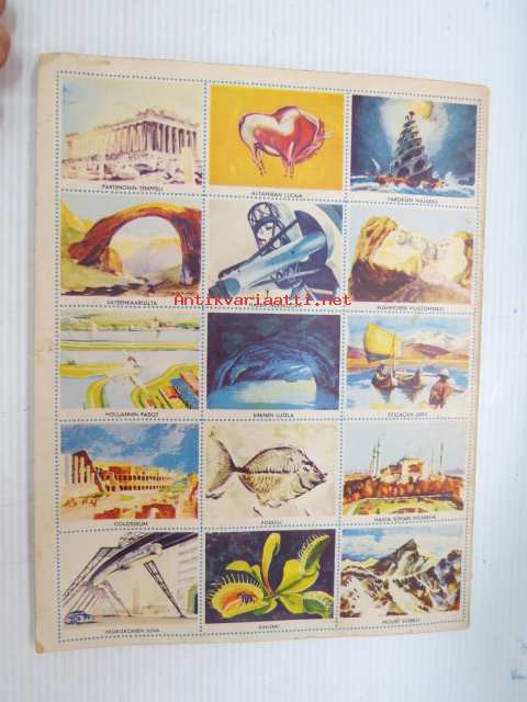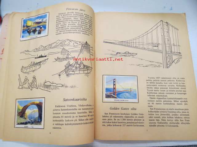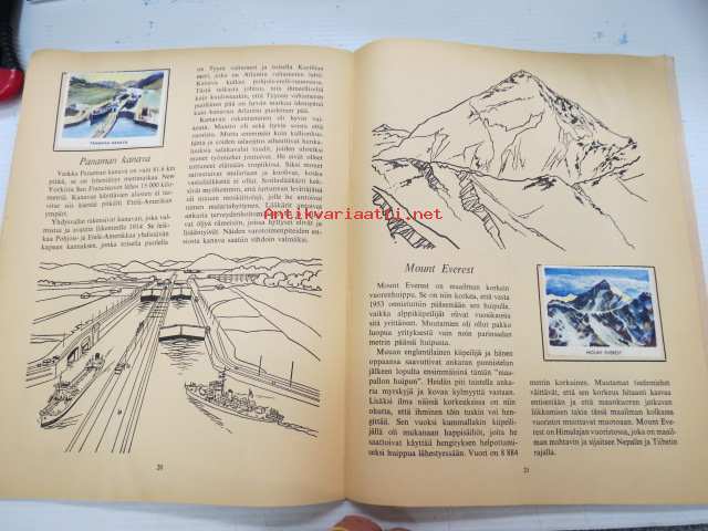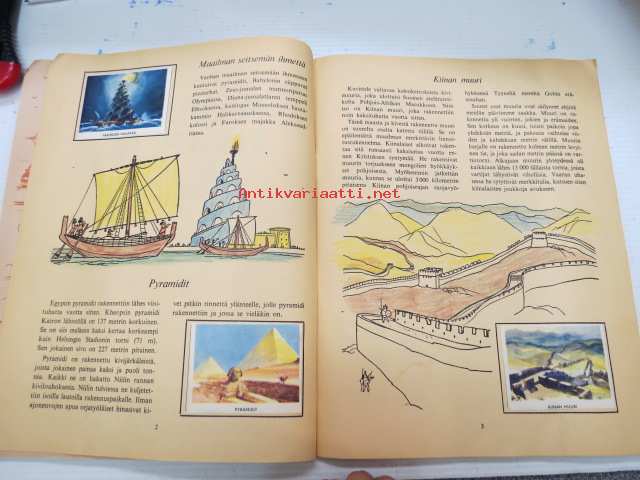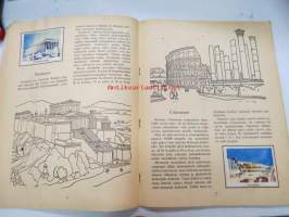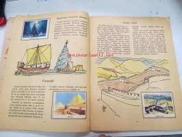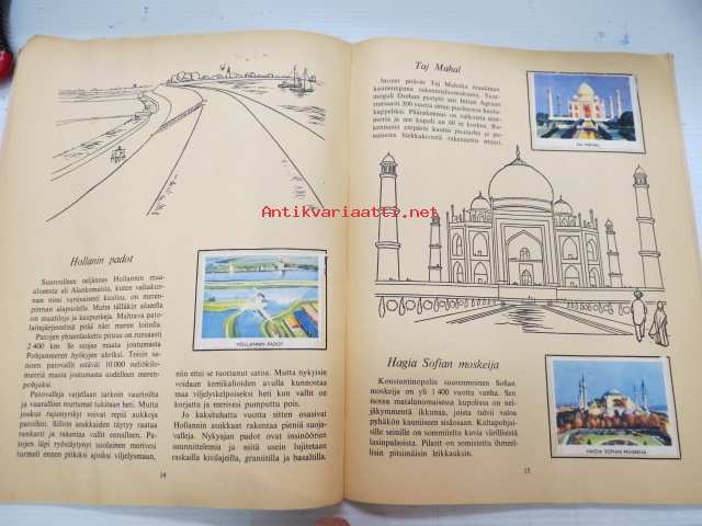 Maailman ihmeitä - Kultaiset askartelukirjat 3, kaikki kuvat liimattu paikoilleen, yhtä aukeamaa väritetty, kaikki sivut näkyvät kuvissa