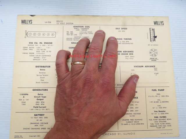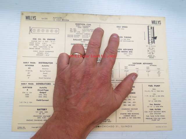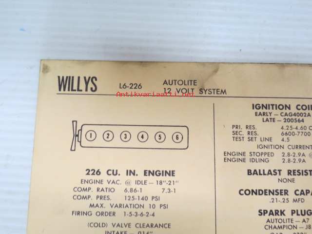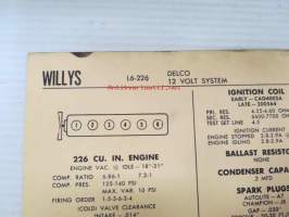 Willys L6-226 Autolite-Delco 12 volt system 1963 Data sheet / Sun Electric Corporation -säätöarvot taulukko