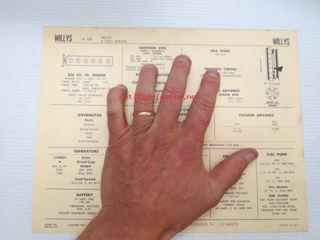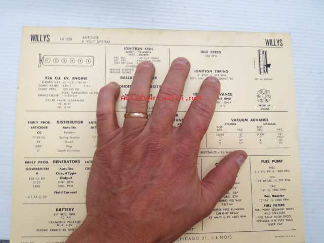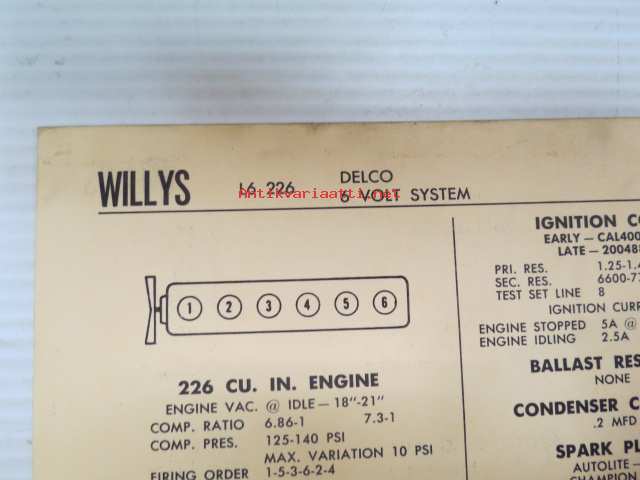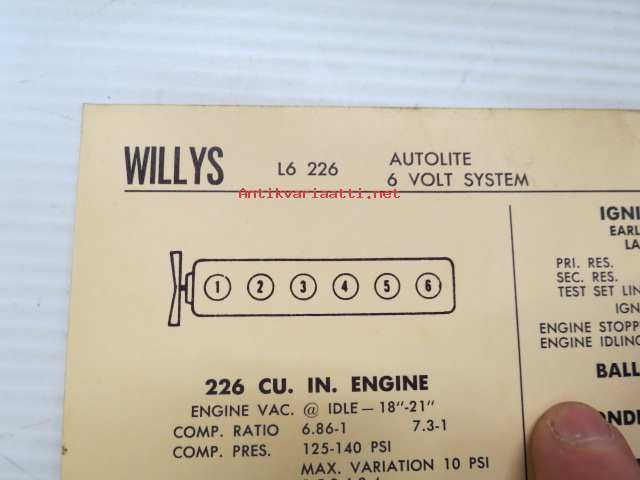 Willys L6-226 Autolite-Delco 6 volt system 1963 Data sheet / Sun Electric Corporation -säätöarvot taulukko