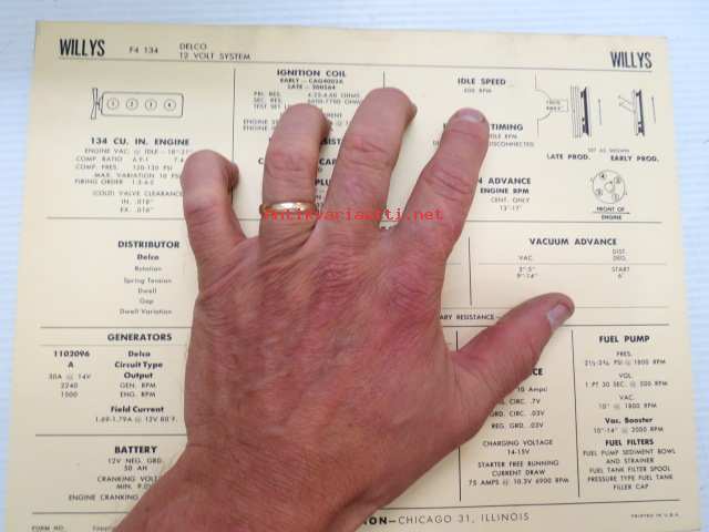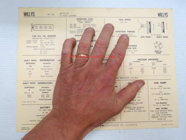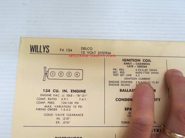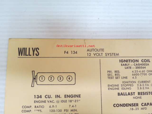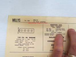Willys F-134 Autolite 12 Volt system / Delco 12 Volt system 1963 Data sheet / Sun Electric Corporation -säätöarvot taulukko