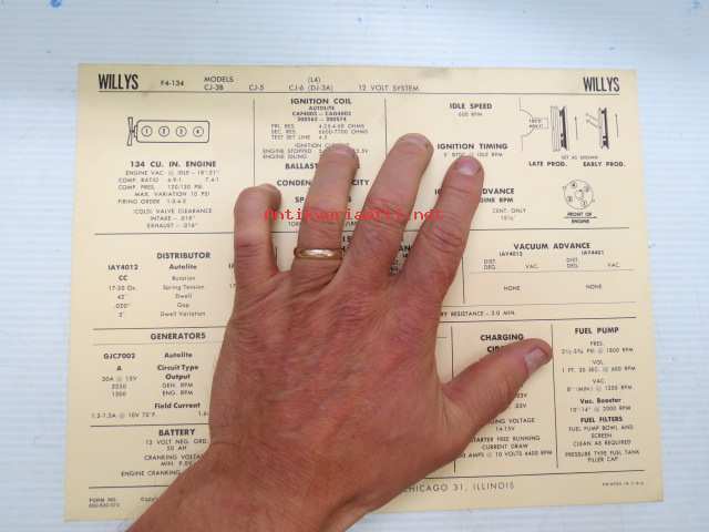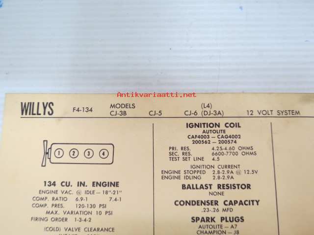 Willys F-134 Models CJ-3B, CJ-5, CJ-6 (L4), (DJ-3A) 12 Volt system 1963 Data sheet / Sun Electric Corporation -säätöarvot taulukko