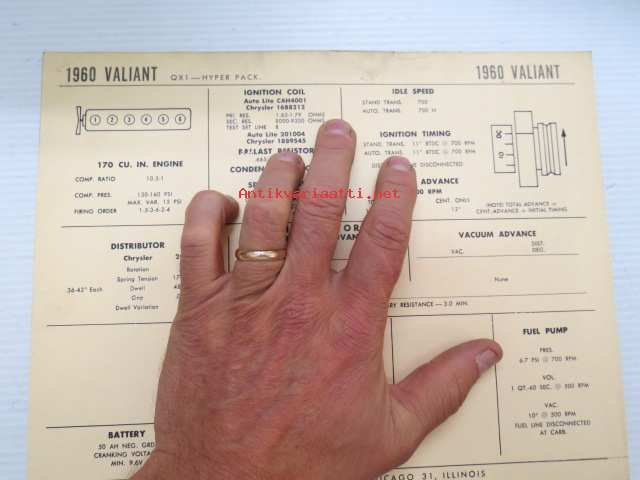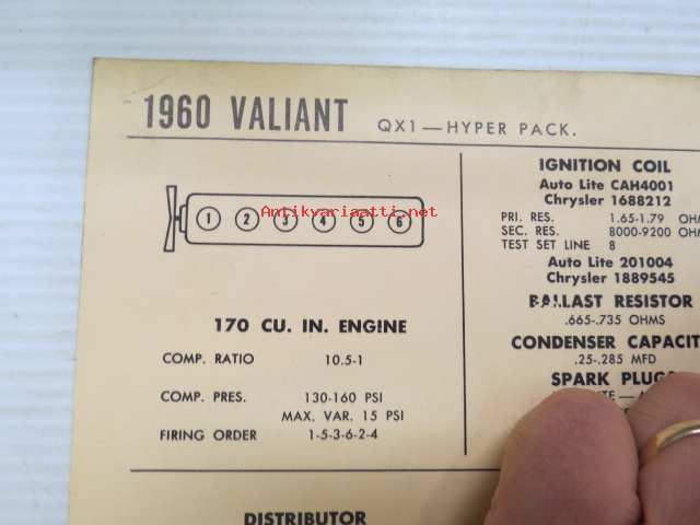 Valiant QX1 - Hyper Pack 1960 Data sheet / Sun Electric Corporation -säätöarvot taulukko