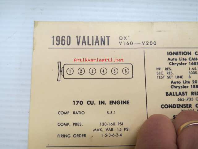 Valiant QX1 V160 - V200 1960 Data sheet / Sun Electric Corporation -säätöarvot taulukko