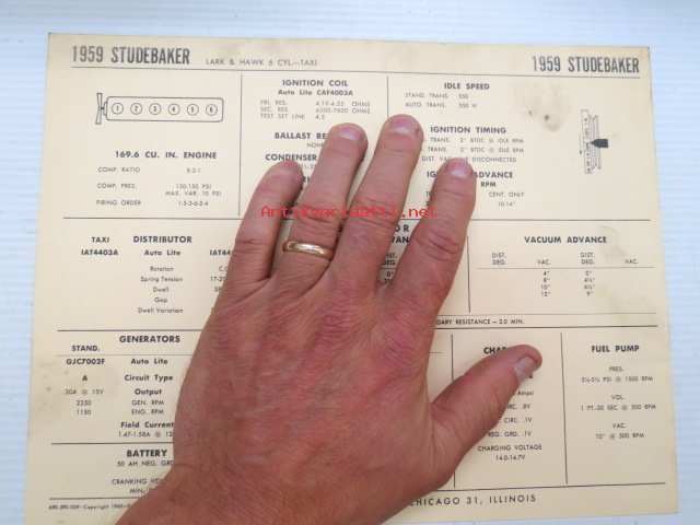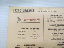 Studebaker Lark & Hawk 6 cyl. - Taxi 1959 Data sheet / Sun Electric Corporation -säätöarvot taulukko
