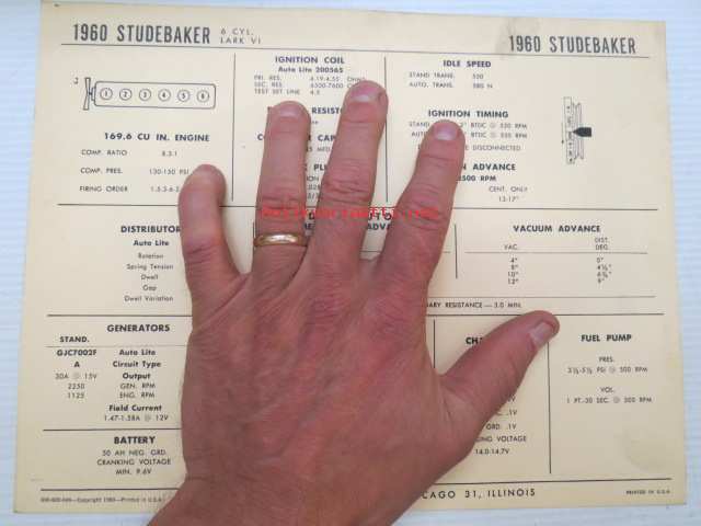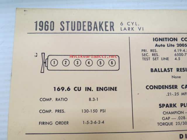 Studebaker Lark VI 6 cyl. 1960 Data sheet / Sun Electric Corporation -säätöarvot taulukko