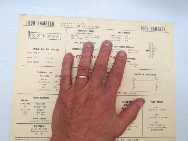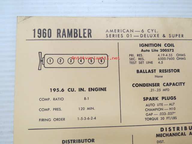 Rambler American - 6 cyl., Series 01 - Deluxe & Super 1960 Data sheet / Sun Electric Corporation -säätöarvot taulukko