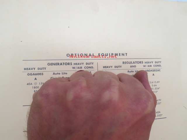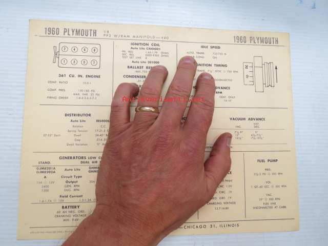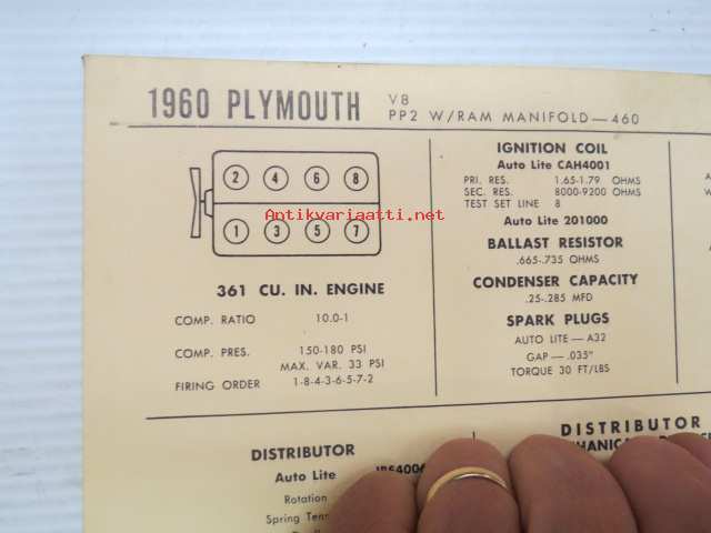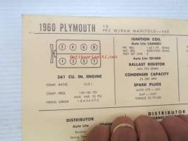 Plymouth V8 PP2 W / Ram Manifold - 460 1960 Data sheet / Sun Electric Corporation -säätöarvot taulukko