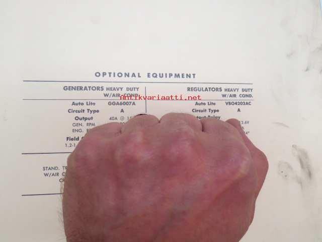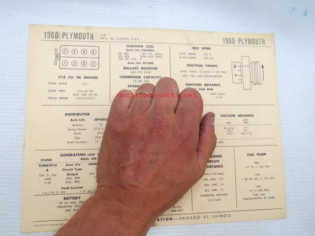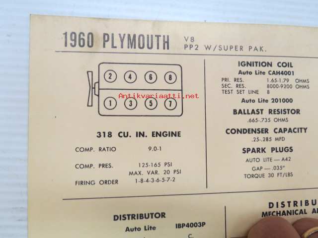 Plymouth V8 PP2 W / Super Pak. 1960 Data sheet / Sun Electric Corporation -säätöarvot taulukko