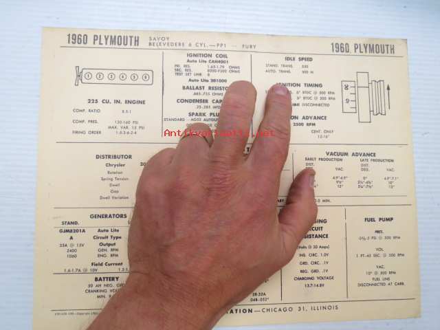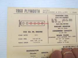 Plymouth Savoy, Belvedere 6 cyl. - PP1 - Fury 1960 Data sheet / Sun Electric Corporation -säätöarvot taulukko